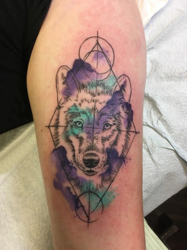 男生手臂上彩绘渐变几何简单线条小动物狼纹身图片