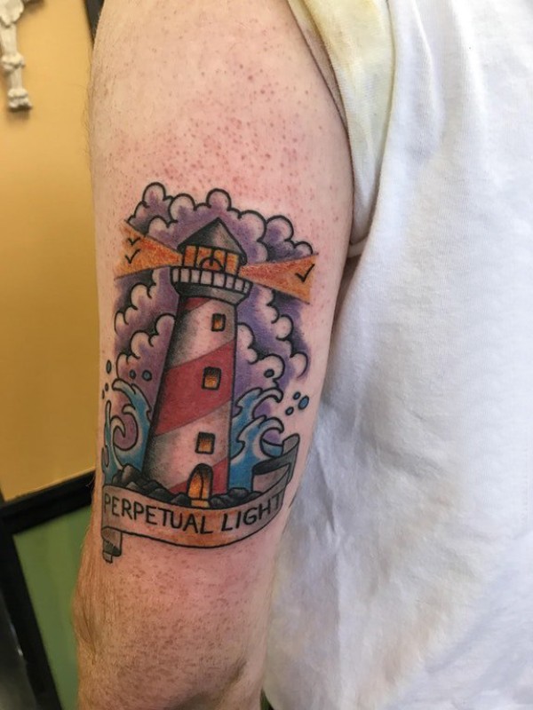男生手臂上彩绘简单线条英文灯塔纹身图片