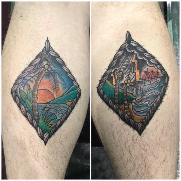 男生小腿上彩绘水彩素描创意文艺风景纹身图片