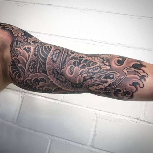 男生手臂上黑灰素描点刺技巧创意蛇纹身图片