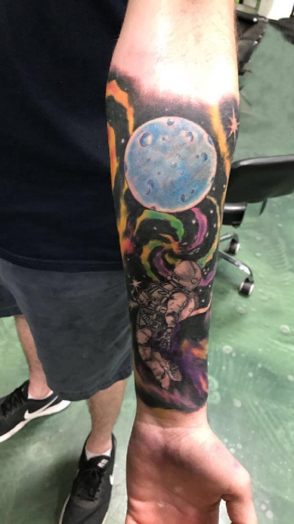 男生手臂上彩绘水彩素描创意霸气宇宙纹身图片