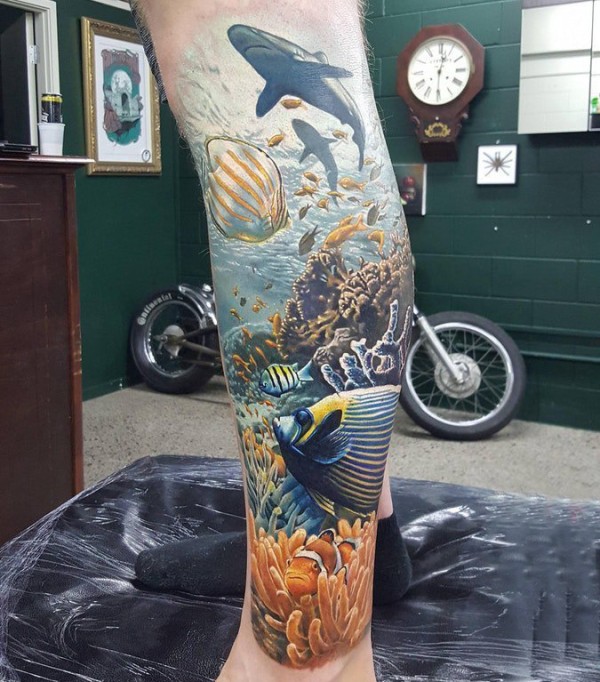 男生手臂上彩绘渐变简单线条珊瑚和鱼海底风景纹身图片