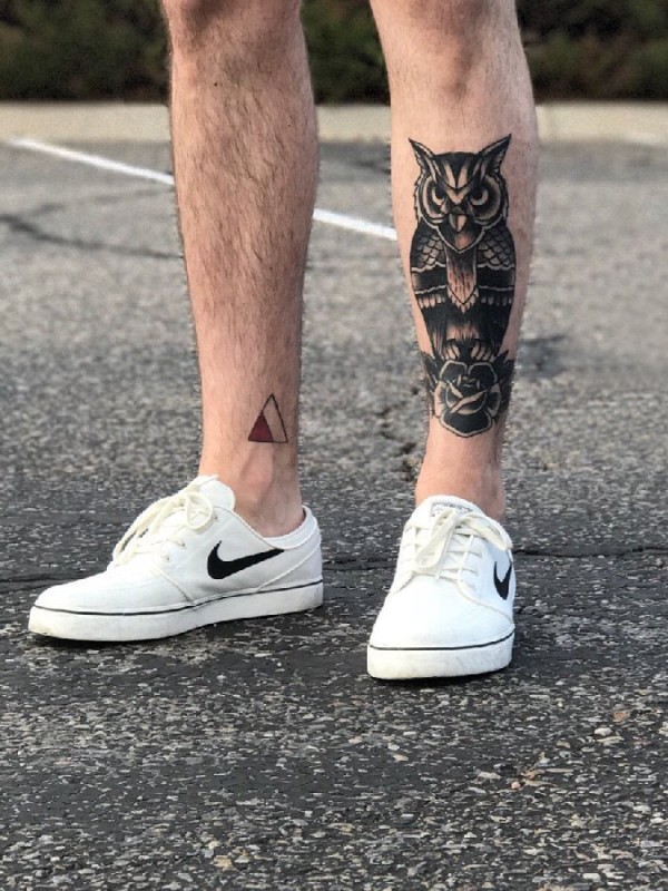 男生小腿上黑灰素描点刺技巧创意猫头鹰纹身图片