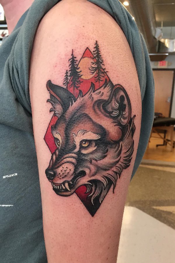 男生手臂上彩绘水彩素描恐怖狼头纹身图片