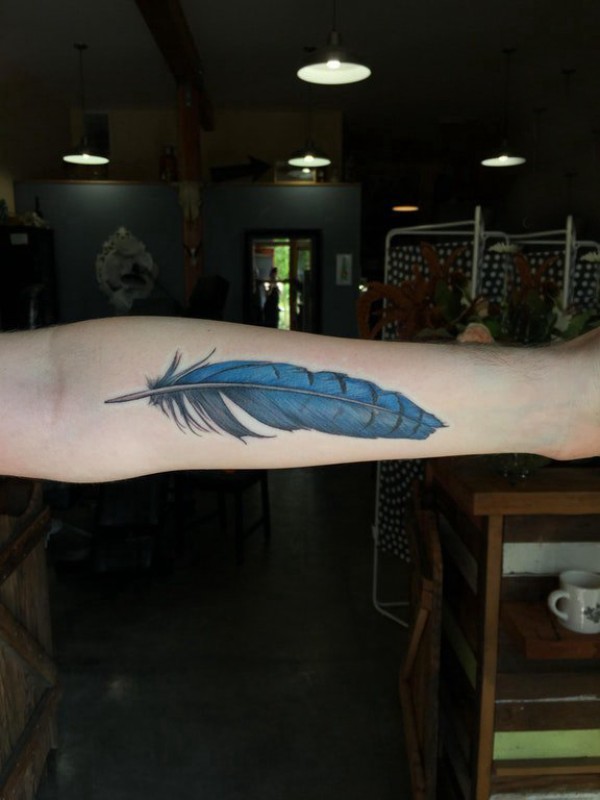 女生手臂上彩绘渐变简单线条羽毛纹身图片