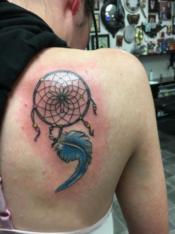 女生后背上彩绘渐变几何简单线条捕梦网纹身图片