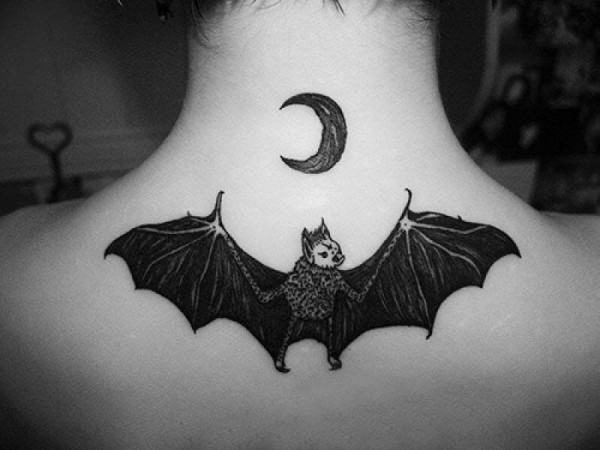 女生颈后黑色点刺简单线条月亮和蝙蝠纹身图片