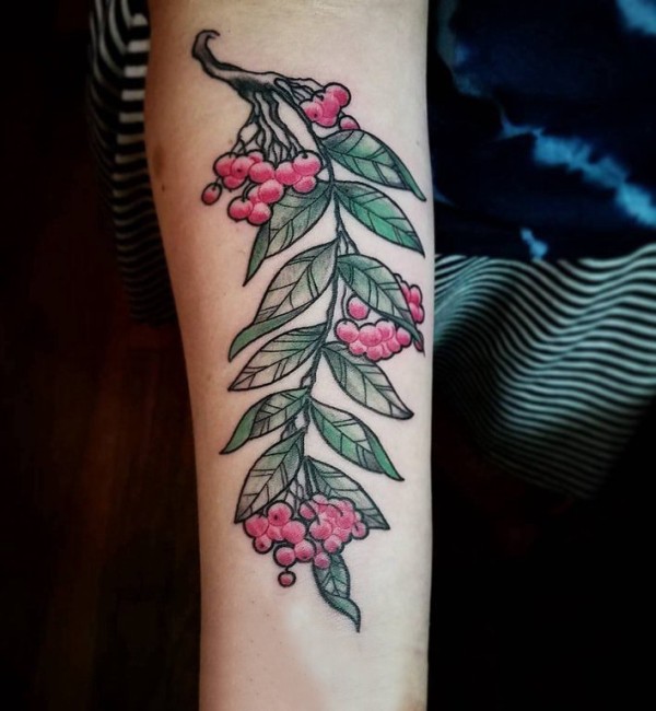 女生手臂上彩绘渐变简单线条植物叶子和果实纹身图片
