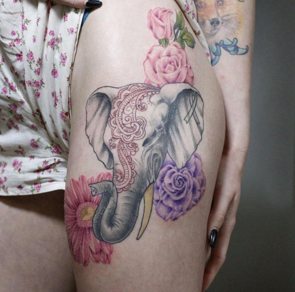 女生大腿上彩绘渐变简单线条花朵和大象纹身图片
