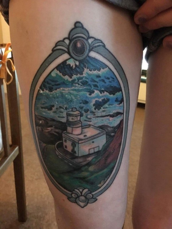 女生大腿上彩绘水彩素描创意文艺唯美风景纹身图片