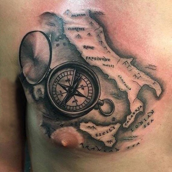 男生胸部黑色几何简单线条地图和指南针纹身图片