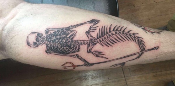 男生小腿上黑灰素描点刺技巧创意美人鱼骷髅纹身图片