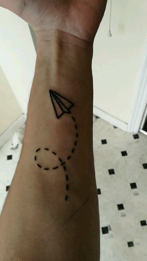 男生手臂上黑色几何元素简单点线飞机纹身图片