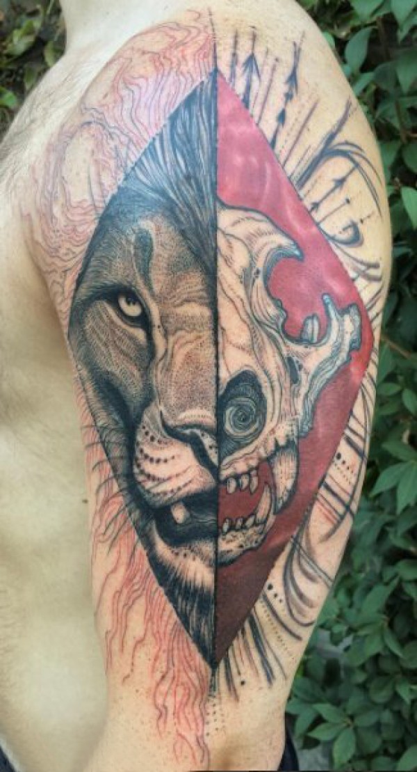 男生手臂上彩绘水彩素描创意狮子头纹身图片