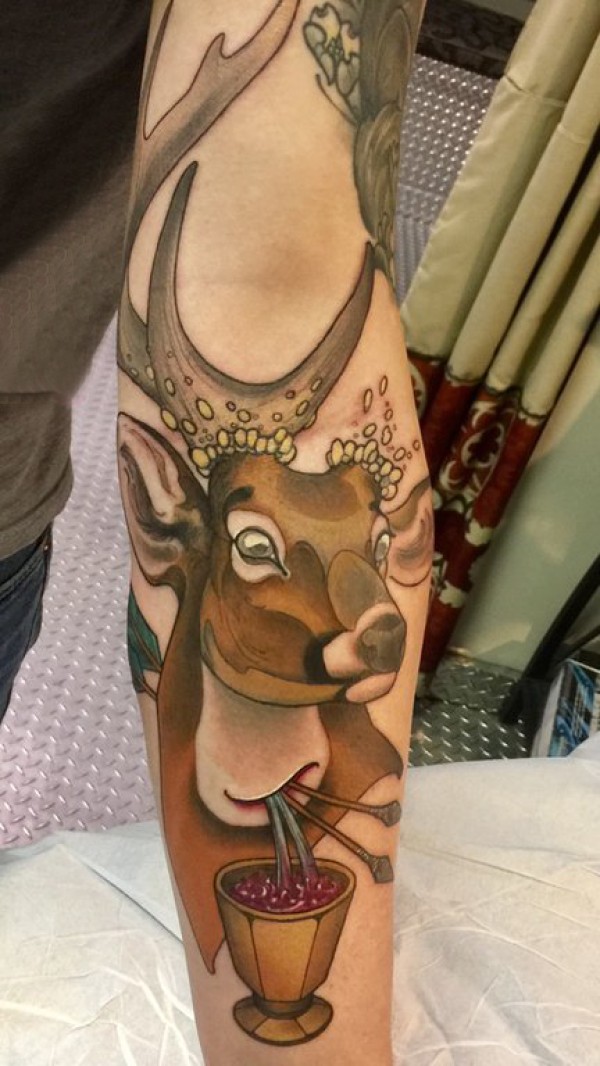 女生手臂上彩绘渐变简单线条小动物麋鹿纹身图片