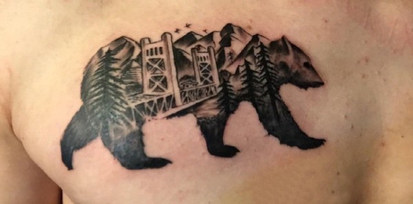 男生胸口上黑灰素描点刺技巧创意熊风景纹身图片
