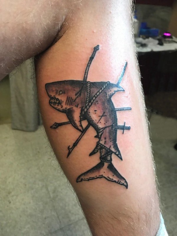 男生小腿上黑灰素描点刺技巧鲨鱼动物纹身图片