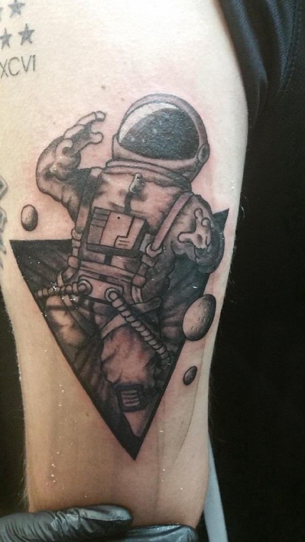 男生手臂上黑色点刺几何简单线条星球和宇航员纹身图片