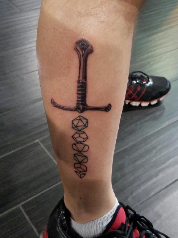 男生小腿上黑灰素描点刺技巧创意匕首纹身图片