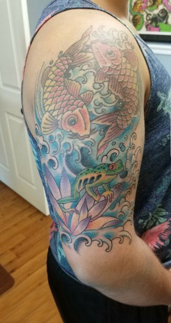 男生手臂上彩绘水彩素描创意鲤鱼花臂纹身图片