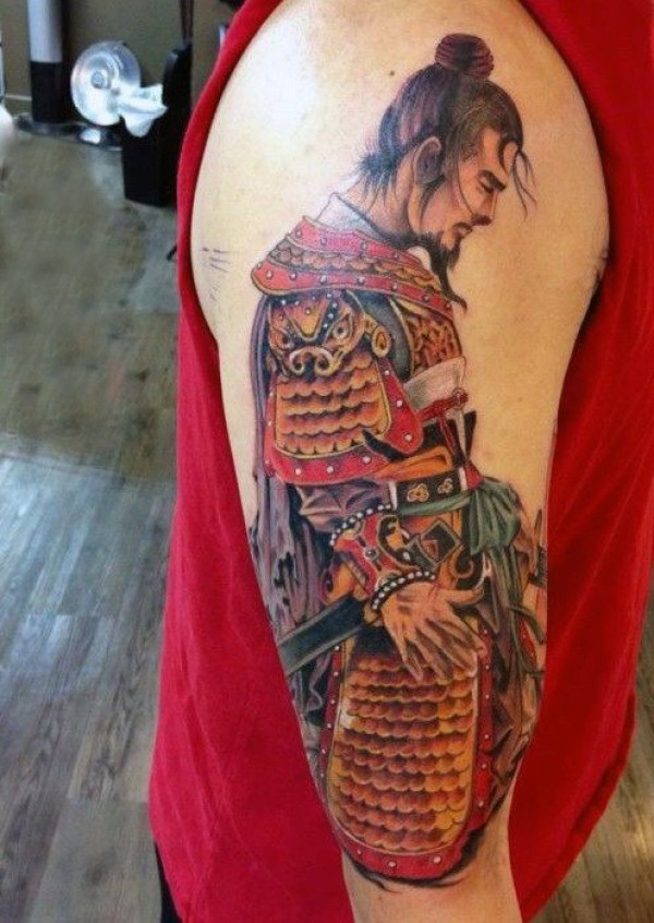 男生大臂上彩绘渐变简单线条人物肖像武士纹身图片