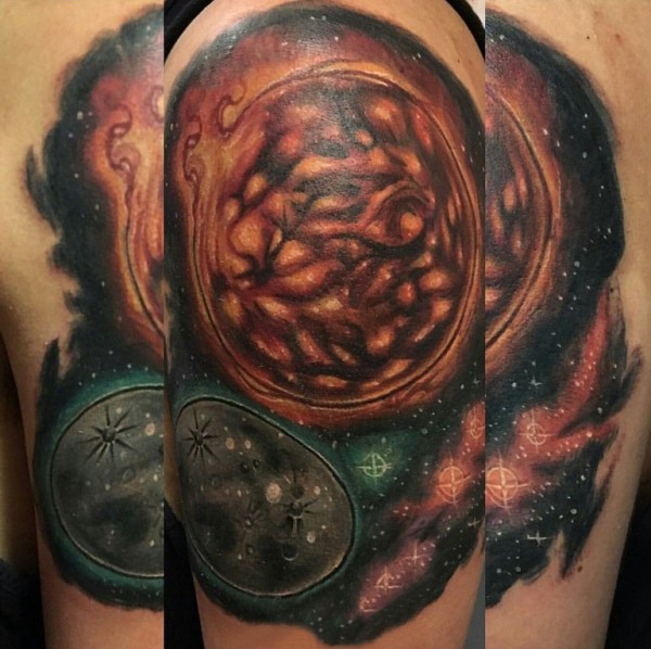 男生大臂上彩绘渐变几何抽象线条星球纹身图片