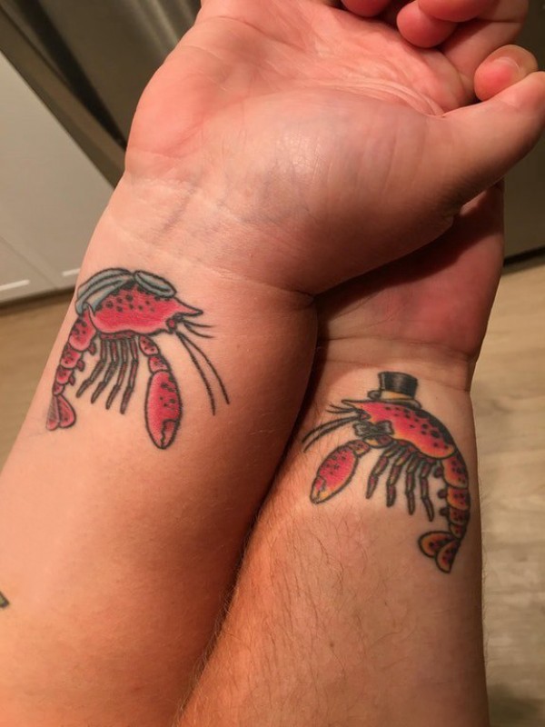 情侣手臂上彩绘简单线条小动物虾纹身图片