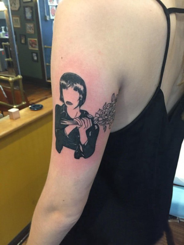 女生手臂上黑色点刺简单线条植物和人物纹身图片