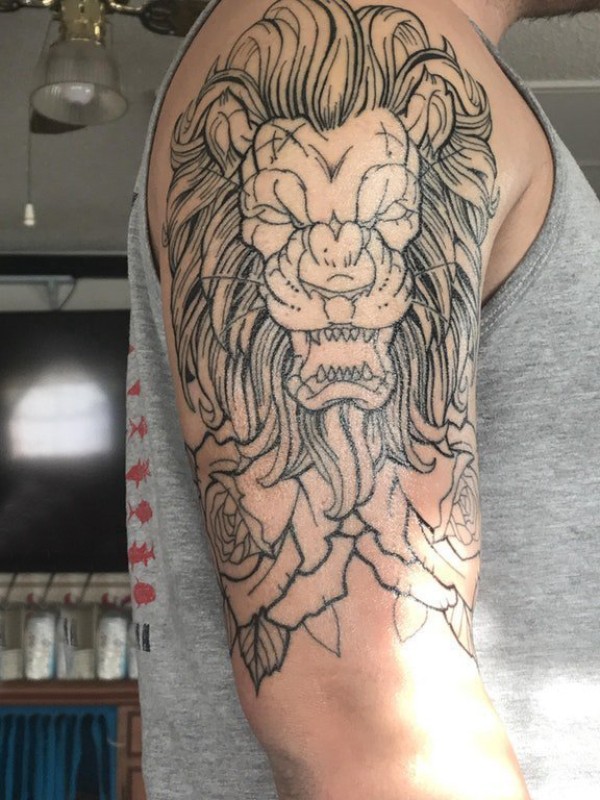 男生大臂上黑色简单抽象线条花朵和小动物狮子纹身图片