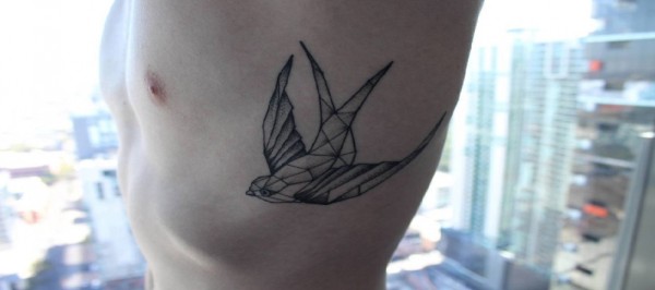 男生侧腰上黑色点刺几何简单线条小动物小鸟纹身图片