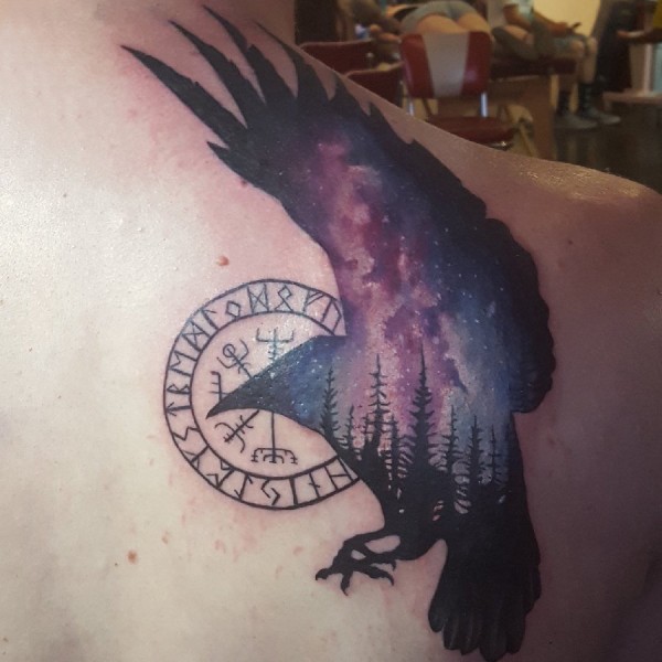 男生后背上彩绘渐变星空元素小动物老鹰纹身图片