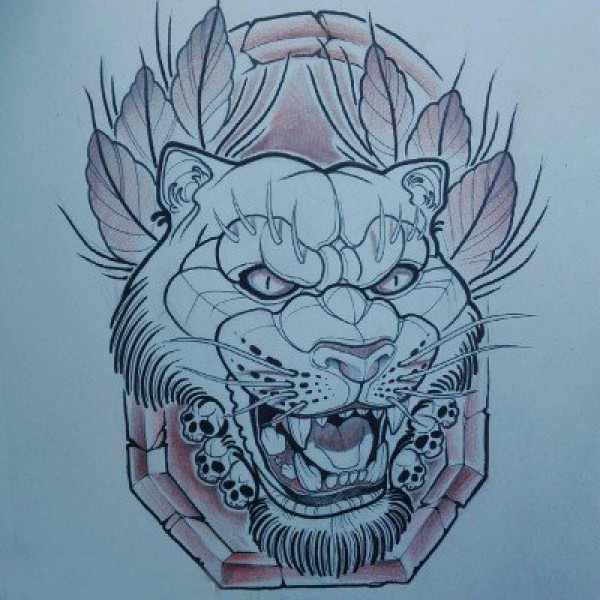 黑色线条素描创意霸气豹子头纹身手稿
