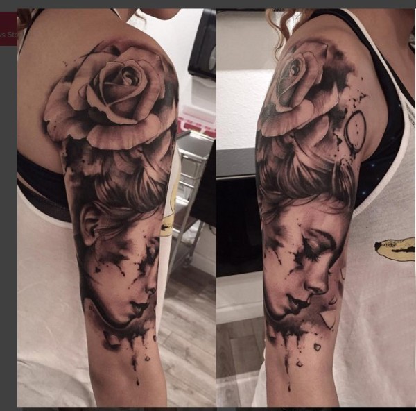 女生手臂上黑灰素描点刺技巧创意唯美花朵女生肖像纹身图片