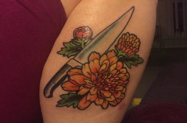 女生大臂上彩绘渐变简单线条匕首和植物花朵纹身图片
