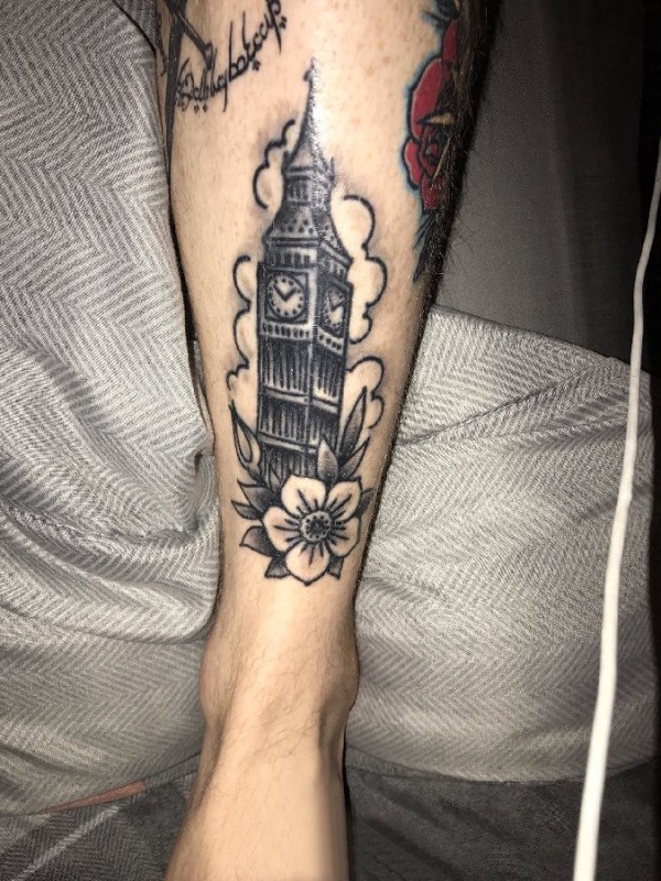 男生小腿上黑色点刺几何简单线条花朵和建筑物纹身图片