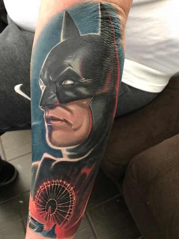 男生手臂上彩绘简单线条英雄人物肖像蝙蝠侠纹身图片