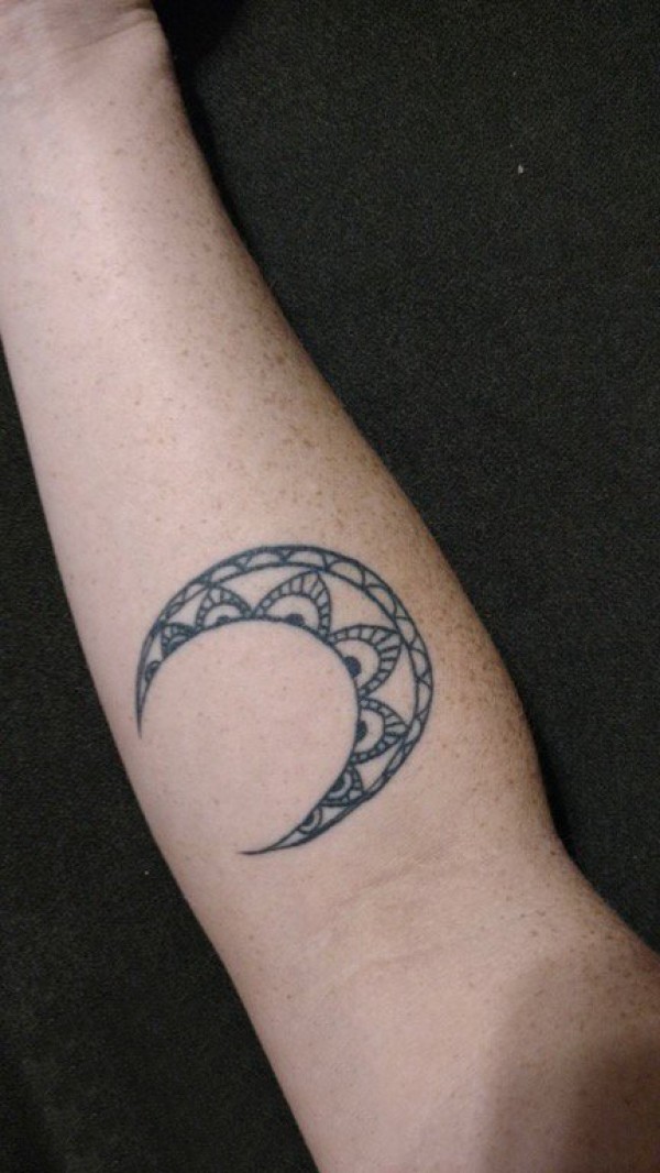 女生手臂上黑色线条素描唯美花纹月亮纹身图片