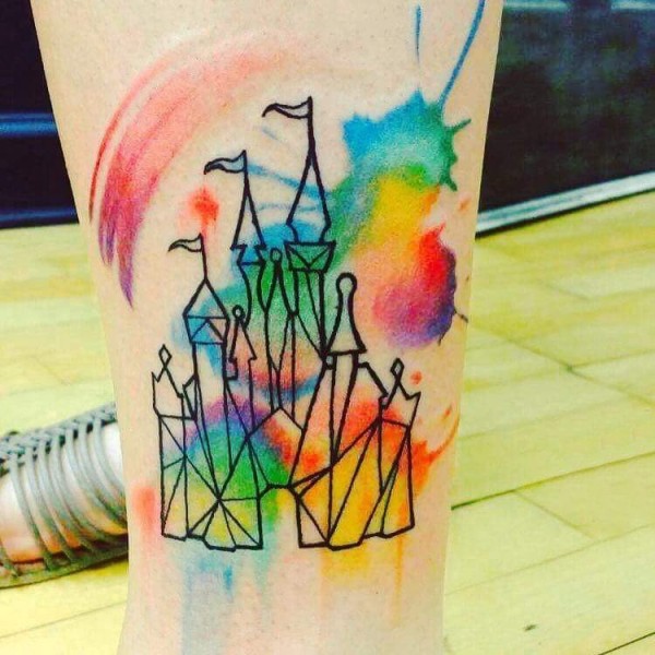男生小腿上黑色线条城堡七彩泼墨纹身图片