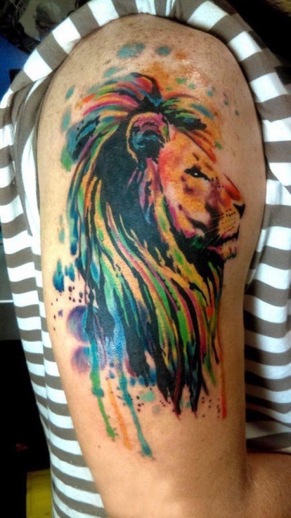 男生大臂上彩绘渐变抽象线条小动物狮子纹身图片