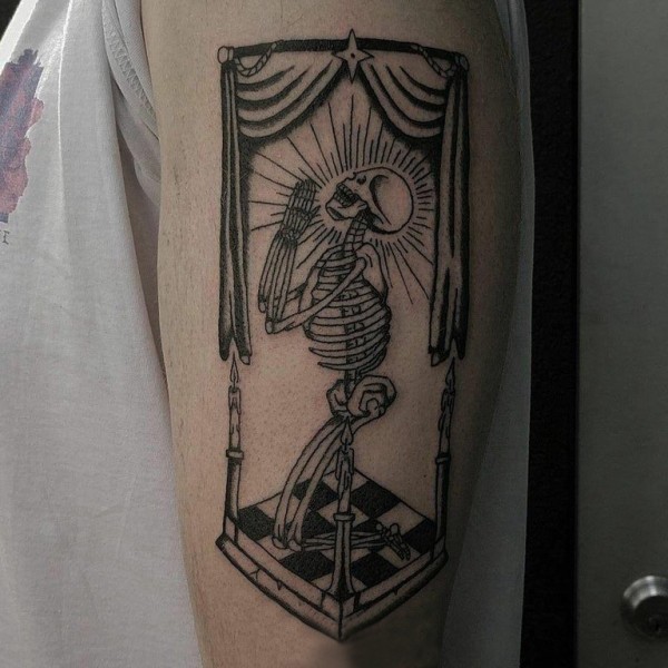 男生手臂上黑色线条恐怖骷髅纹身图片