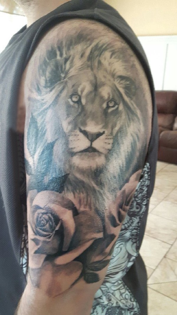 男生手臂上黑灰素描点刺技巧创意霸气狮子头纹身图片