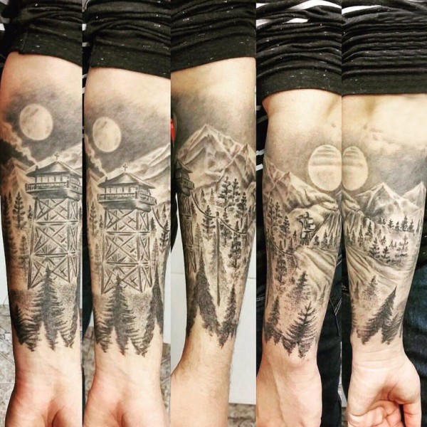 男生手臂上黑灰素描点刺技巧唯美风景纹身图片