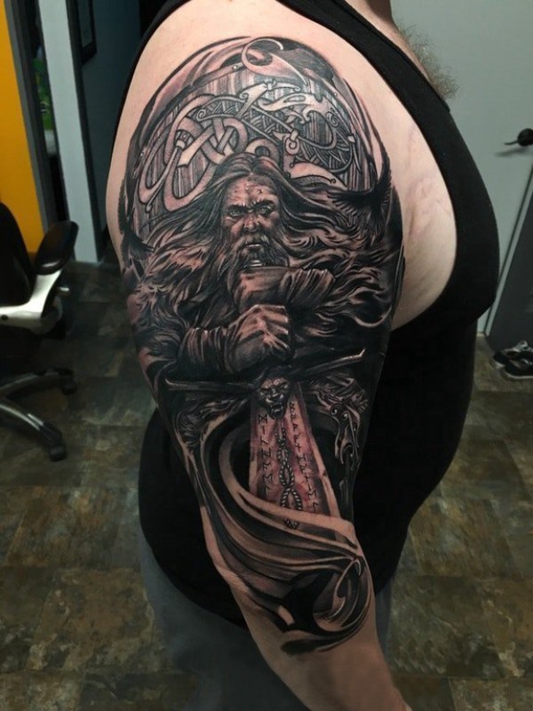 男生手臂上黑灰素描点刺技巧创意霸气人物纹身图片