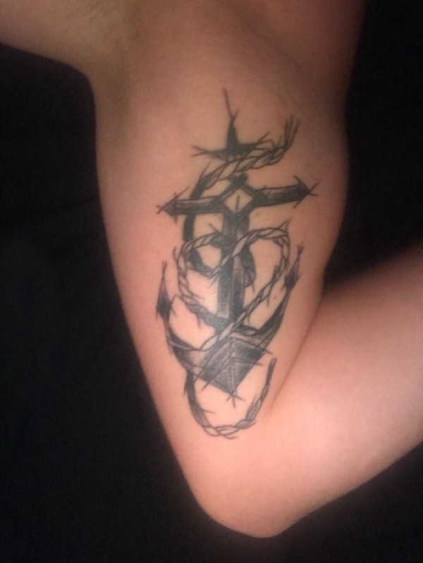 男生手臂上黑灰素描点刺技巧海军风船锚纹身图片