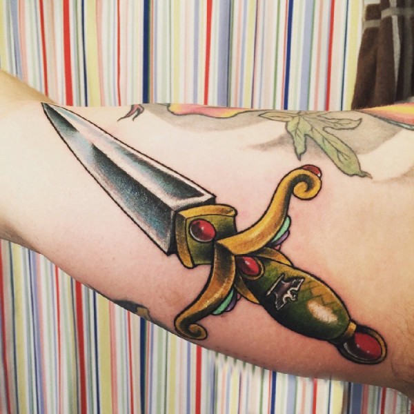 男生手臂上彩绘渐变几何简单线条匕首纹身图片