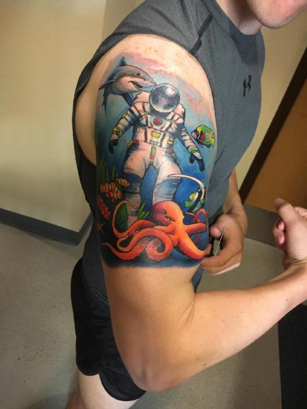 男生手臂上彩绘水彩素描创意文艺神秘宇航员纹身图片