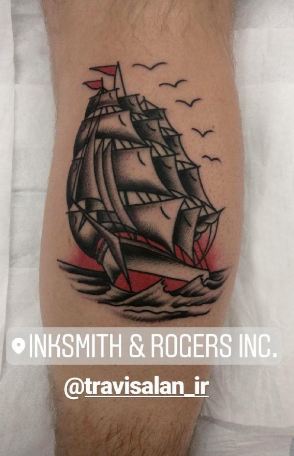 男生小腿上黑灰素描点刺技巧霸气帆船纹身图片