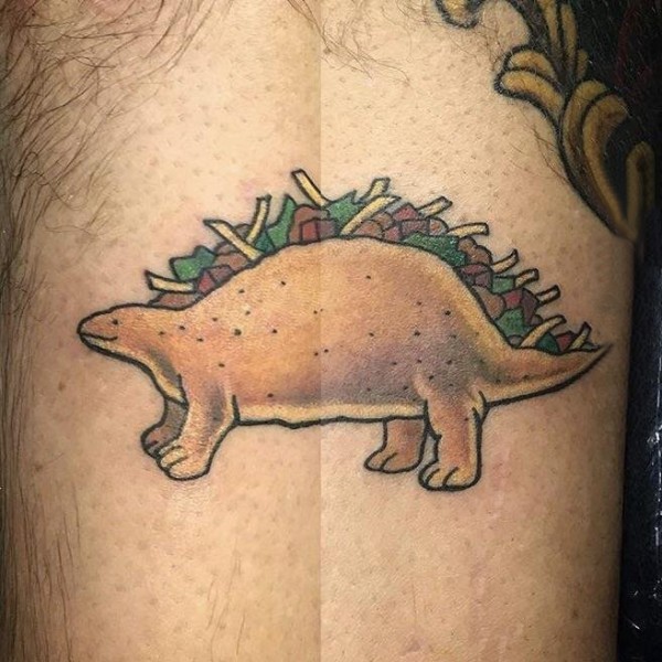 男生大腿上彩绘简单线条卡通食物型小动物恐龙纹身图片