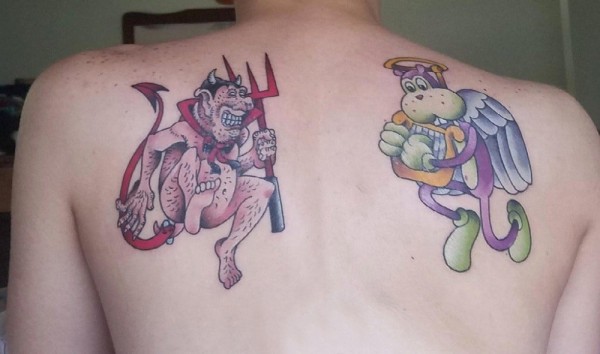 男生后背上彩绘简单线条卡通天使和恶魔纹身图片