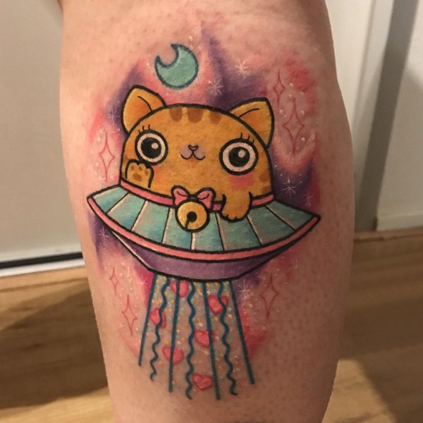 男生小腿上彩绘几何简单线条卡通飞碟和猫咪纹身图片